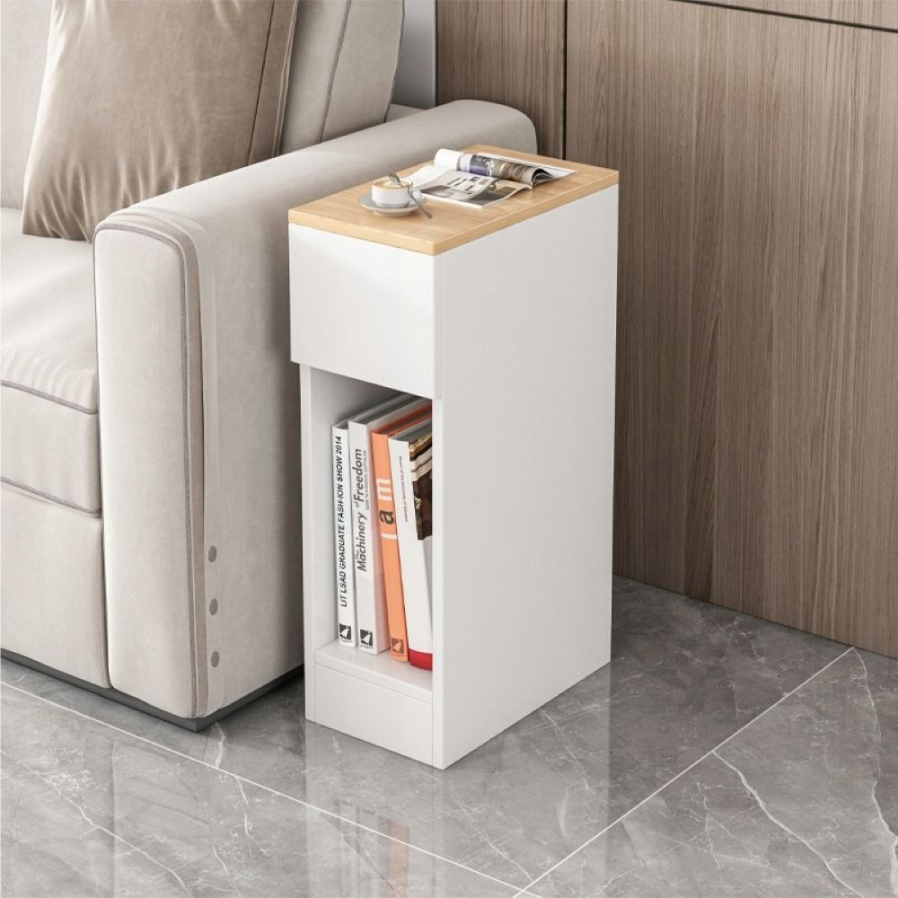 Praktyczna szuflada świetnie nadaje się do przechowywania osobistych przedmiotów, takich jak okulary, książki czy ładowarki, natomiast otwarta półka na dole zapewnia dodatkowe miejsce na lektury wieczorne lub dekoracje.