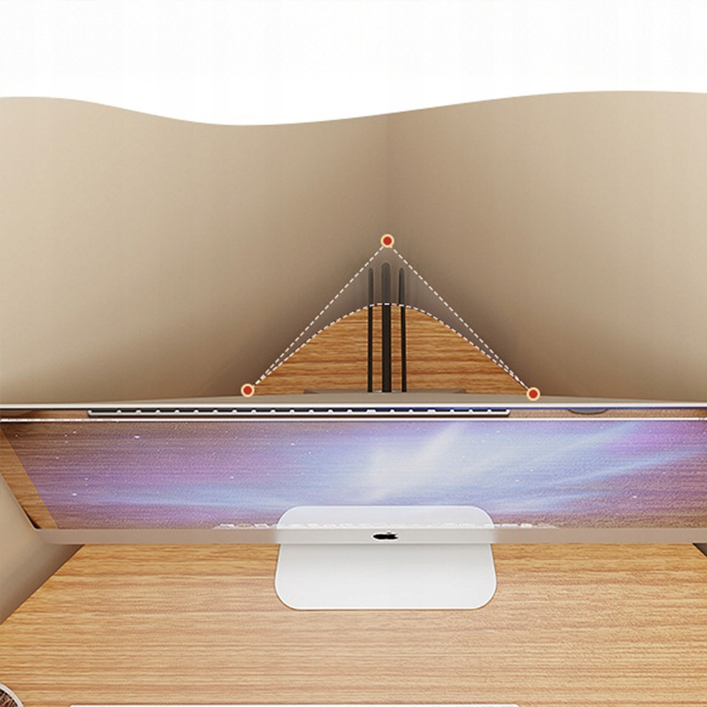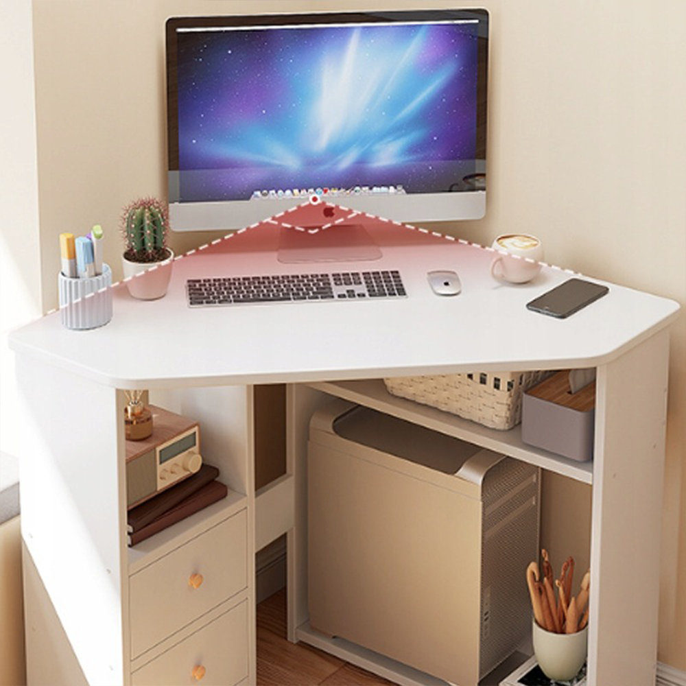 Ten trójkątny narożny biurko jest idealne do małych mieszkań lub biur. Doskonale mieści się w rogu pomieszczenia, oszczędzając miejsce bez kompromisów w funkcjonalności. Przestronna powierzchnia robocza oraz wbudowane półki zapewniają efektywną organizację i komfort codziennego użytkowania.