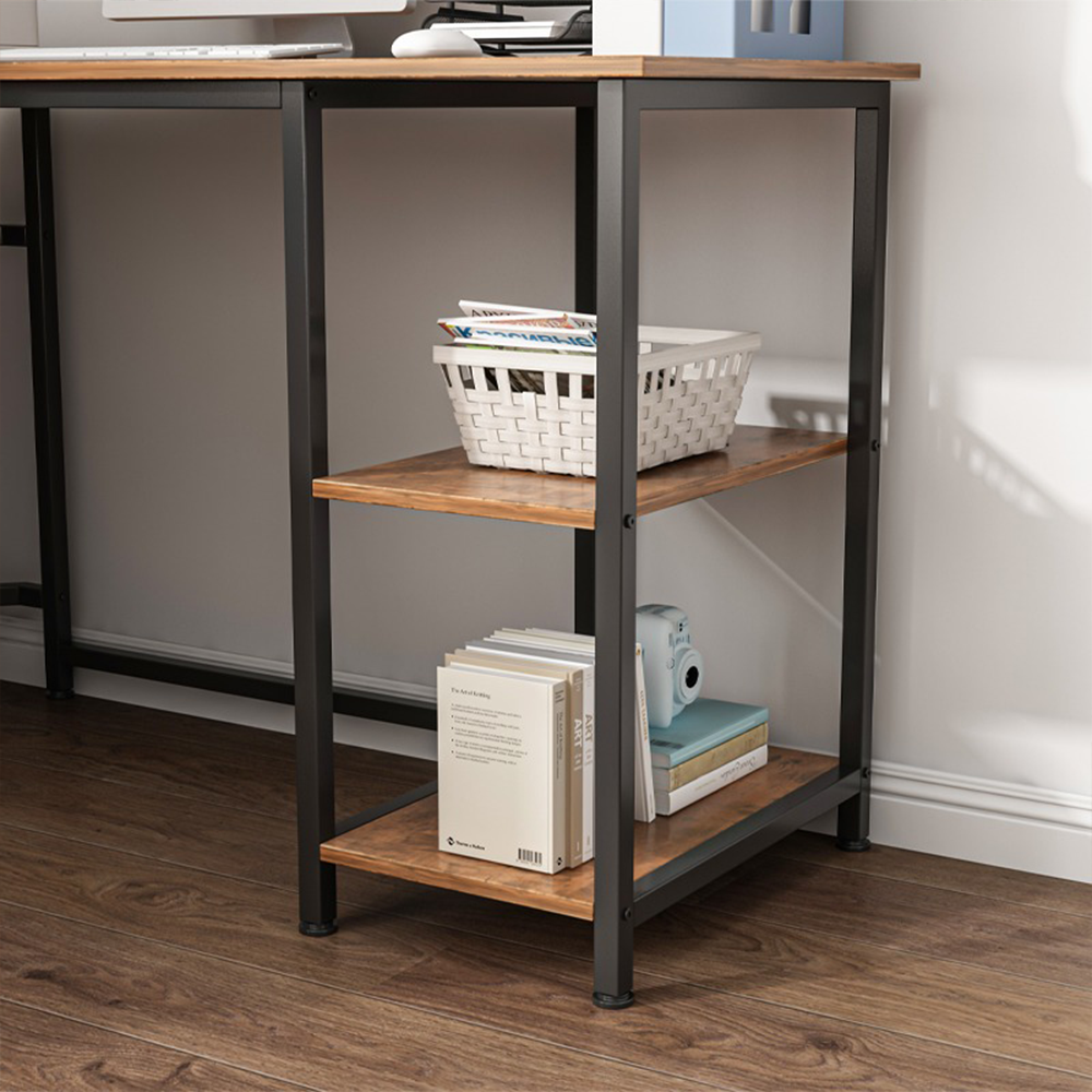 Blat w ciepłym odcieniu postarzanego drewna wprowadza przytulną atmosferę, natomiast czarna metalowa rama zapewnia stabilność i trwałość. Pojemna szuflada oraz boczne półki oferują dużo miejsca do uporządkowanego przechowywania akcesoriów biurowych, książek czy dokumentów.