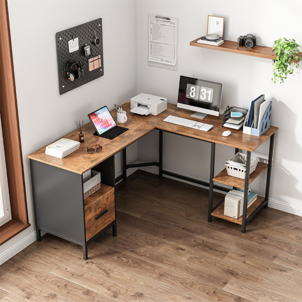 Odkryj to narożne biurko w stylu vintage rustic, które oferuje ergonomiczną i nowoczesną przestrzeń do pracy, wzbogaconą o industrialny design z charakterem. Kształt litery L pozwala na efektywne wykorzystanie narożników pomieszczenia, co czyni je idealnym wyborem do domowego biura, pokoju do nauki lub przestrzeni nastolatka.