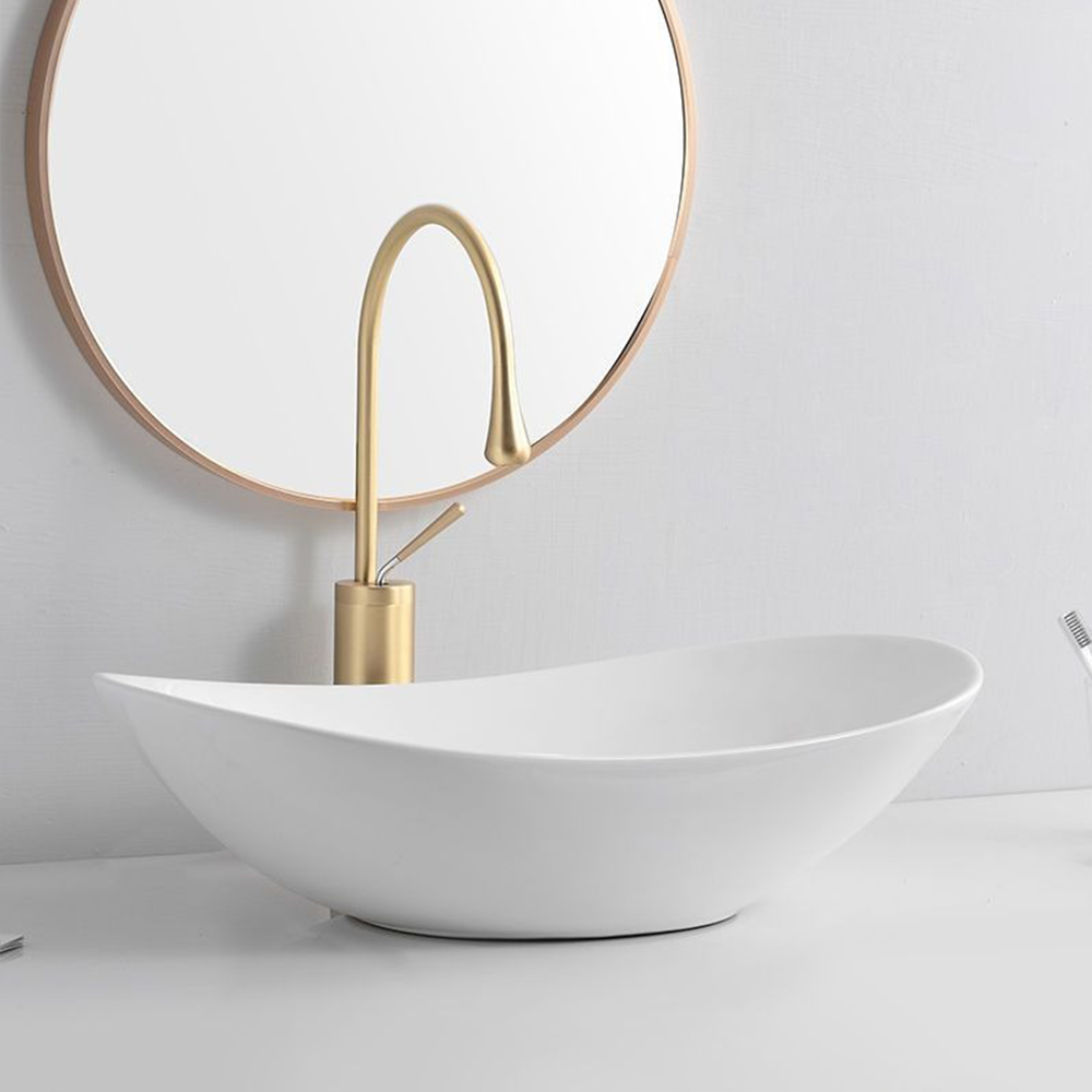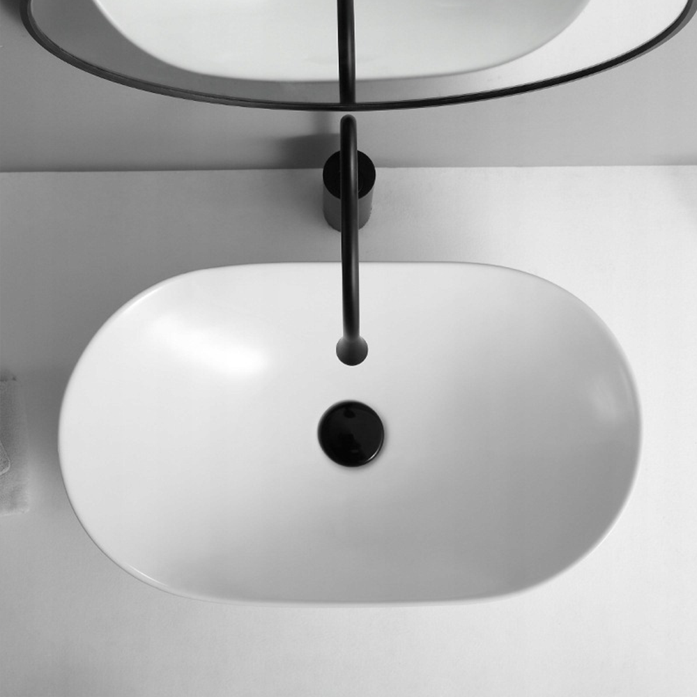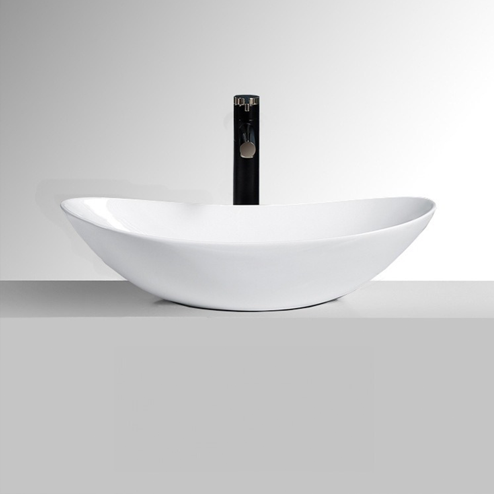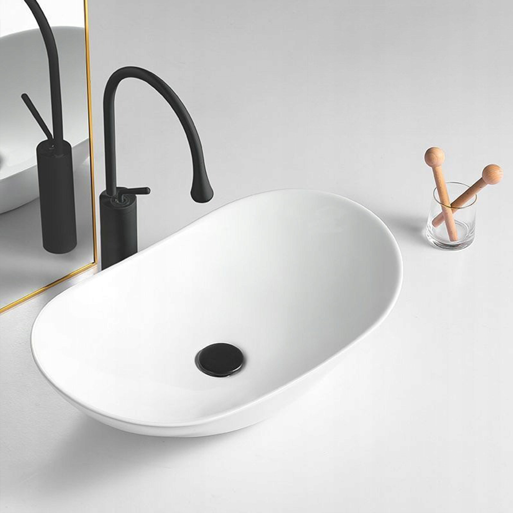 Owalna umywalka z białej, błyszczącej ceramiki do łazienki, 60,5×36×15 cm