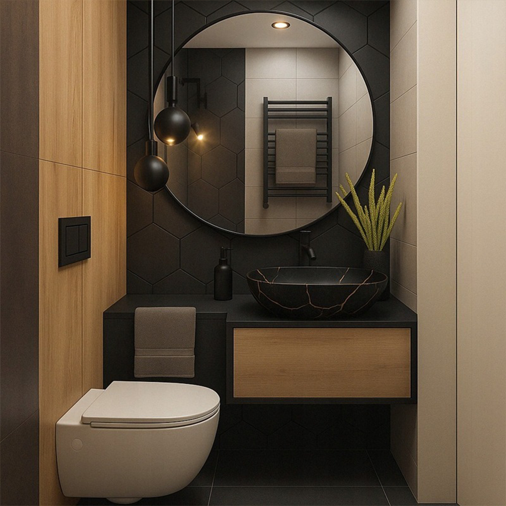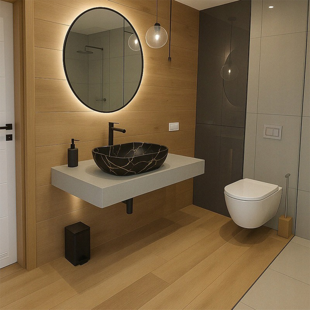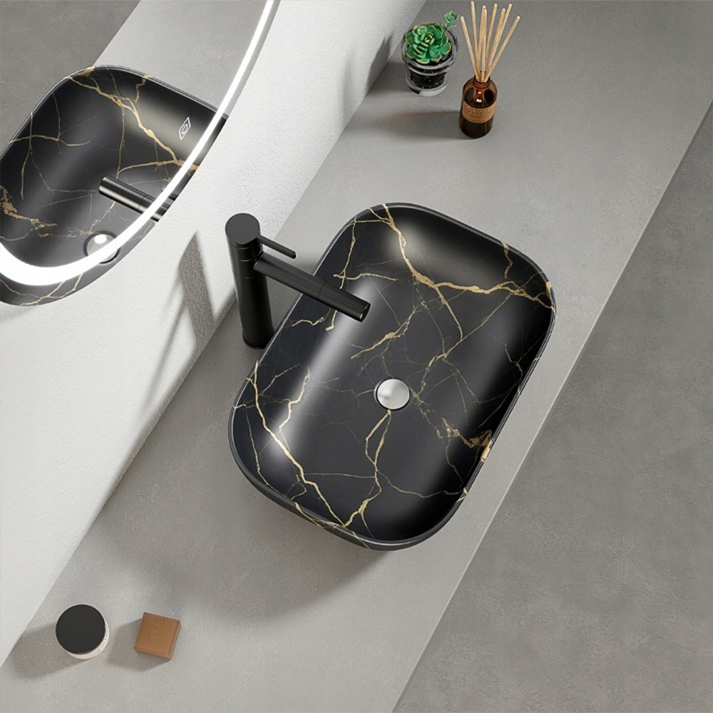 Odmień swoją łazienkę, nadając jej elegancji i wyrafinowania dzięki tej umywalce nablatowej wykonanej z ceramiki sanitarnej, w matowym czarnym wykończeniu z efektem złotych żyłek w stylu marmuru. Dzięki kompaktowym wymiarom (46,5 × 33 × 13,5 cm) jest to idealny wybór do łazienek nowoczesnych, minimalistycznych lub inspirowanych luksusem.